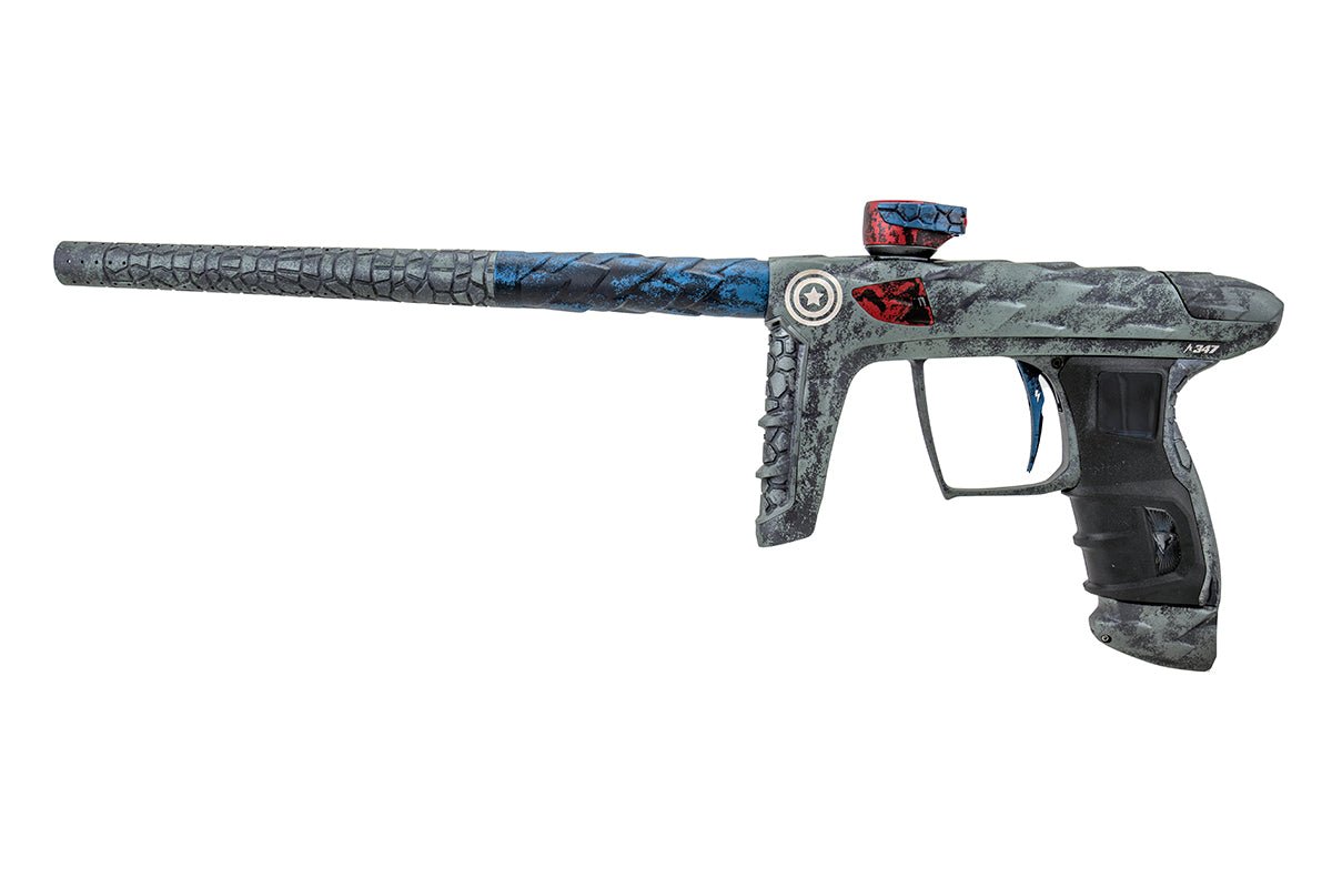 Adrenaline Luxe IDOL in John Kurzawa's Captain America finish. John's design is a distressed gun metal with distressed red and blue parts much like the Mad Max except the green and brown elements are red and blue and the Max Max lasering is substituted for Captain America shield. Signature Series Adrenaline Luxes include Signature Series anodizing, custom mechanical wood grip in applicable Signature Series pattern and separate serial number on right side of the unit in that limited edition Signature Series run.