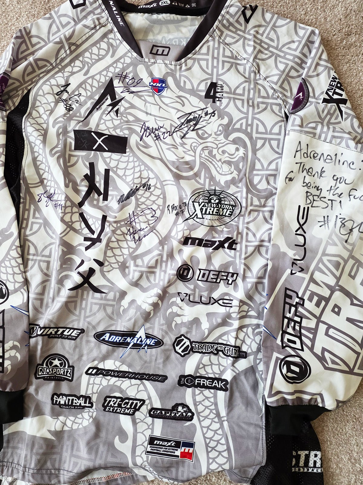The New York Xtreme special edition colab jersey from Adrenaline and Maxt Sportswear worn at the 2025 NXL Lone Star Open by NYX and autographed by the whole NYX team at World Cup. All are blank on the name/number portion except for the one Will Hennessy which is also signed on the back seperately by Will. Note the White 2XL has explicit (but true) language as shown in the photo.